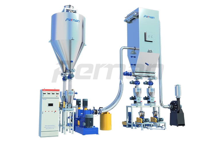 物料由加料系統均勻的送入粉碎室受到高速旋轉的粉碎盤的強烈沖擊,同時受到離心力的作用,與粉碎齒圈發生碰撞,受到剪切、摩擦、碰撞等多種綜合力的作用,使物料粉碎,被粉碎的物料隨氣流運動到分級區,通過變頻調節的分級輪,對粗細物料進行分離,符合細度要求的產品隨氣流進入旋風收集器和除塵器收集,粗物料返回分級區二次粉碎。